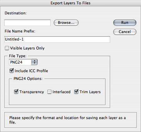 While presenting a seminar on "Photoshop & Flash: Optimizing Pixels and Workflow" at the Macromedia Max conference, Mike Ninness mentioned that he wished Photoshop's 'Layers To Files' script could save to PNG. A friend in the audience sent me an email, so I whipped something together that night.